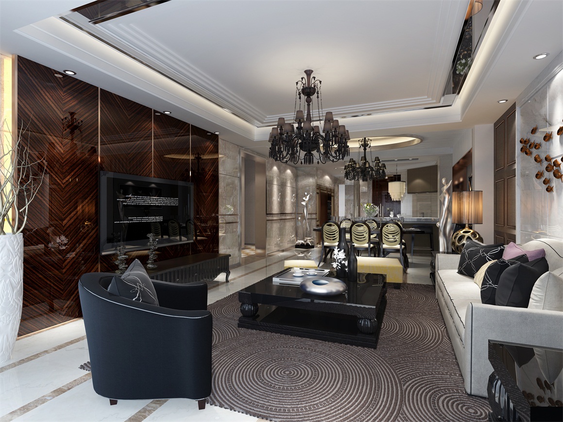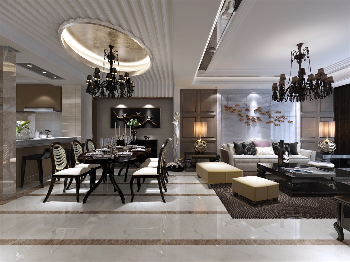 簡一大理石瓷磚,水刀平花,實木木工板,石膏板吊頂,多樂士乳膠漆。