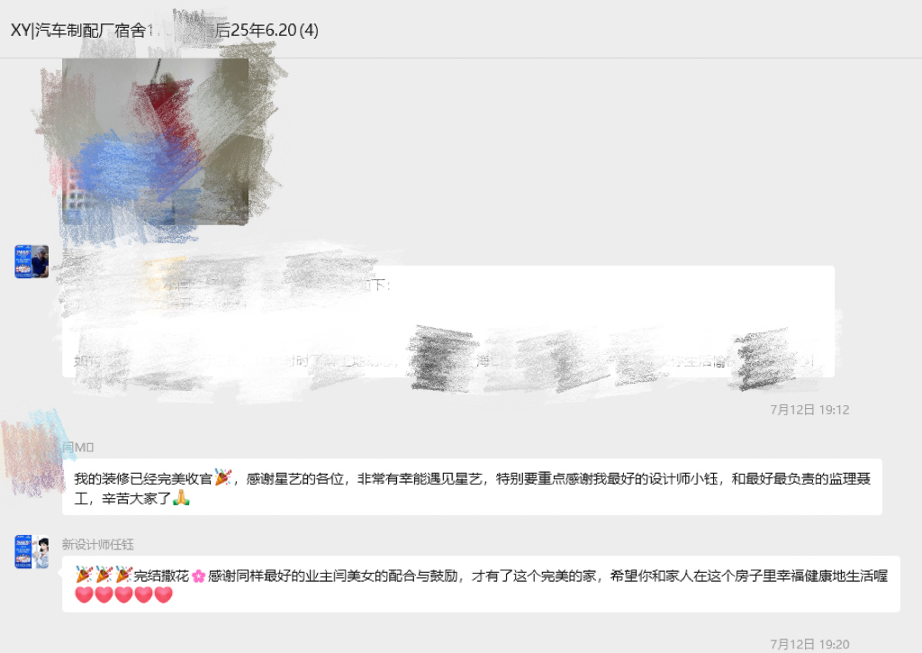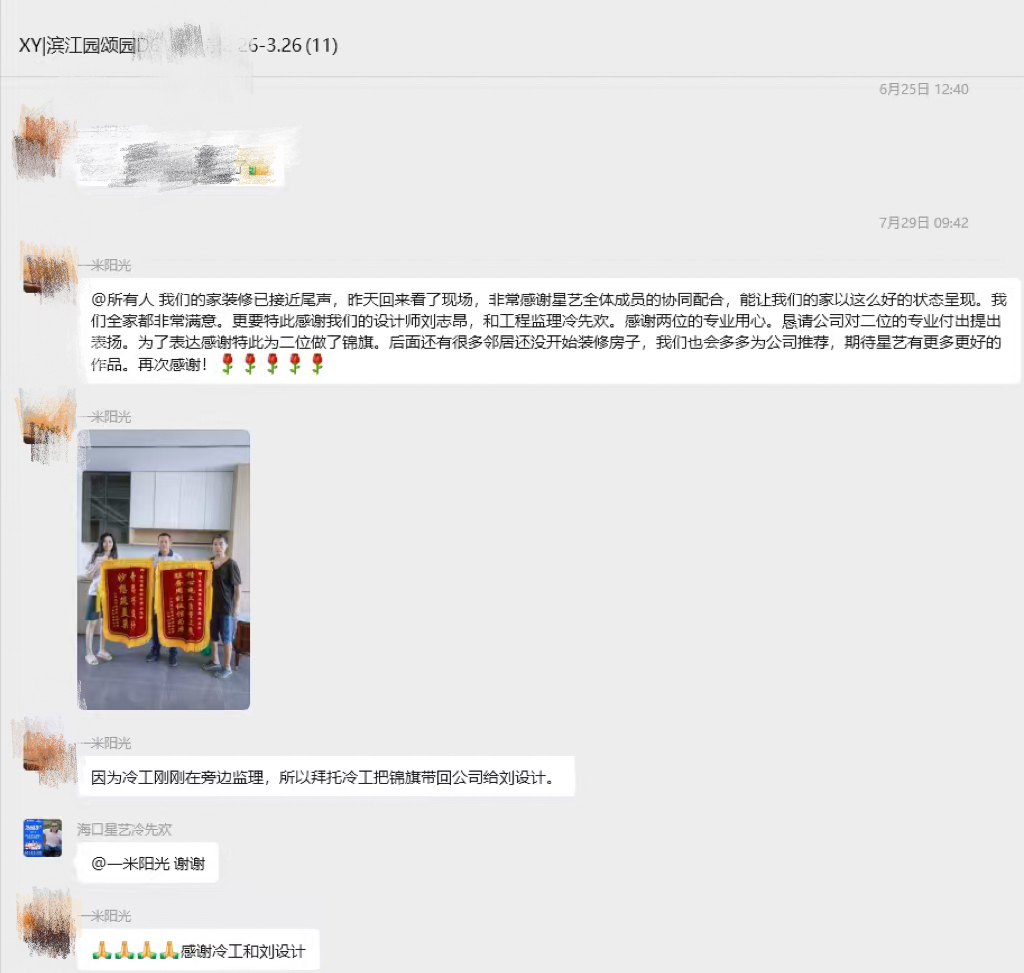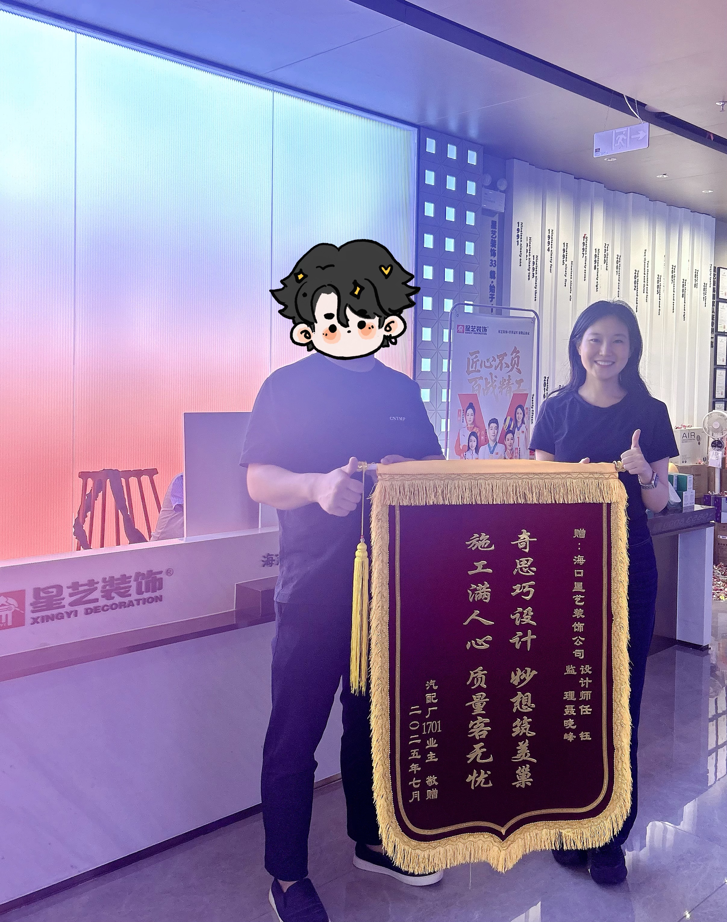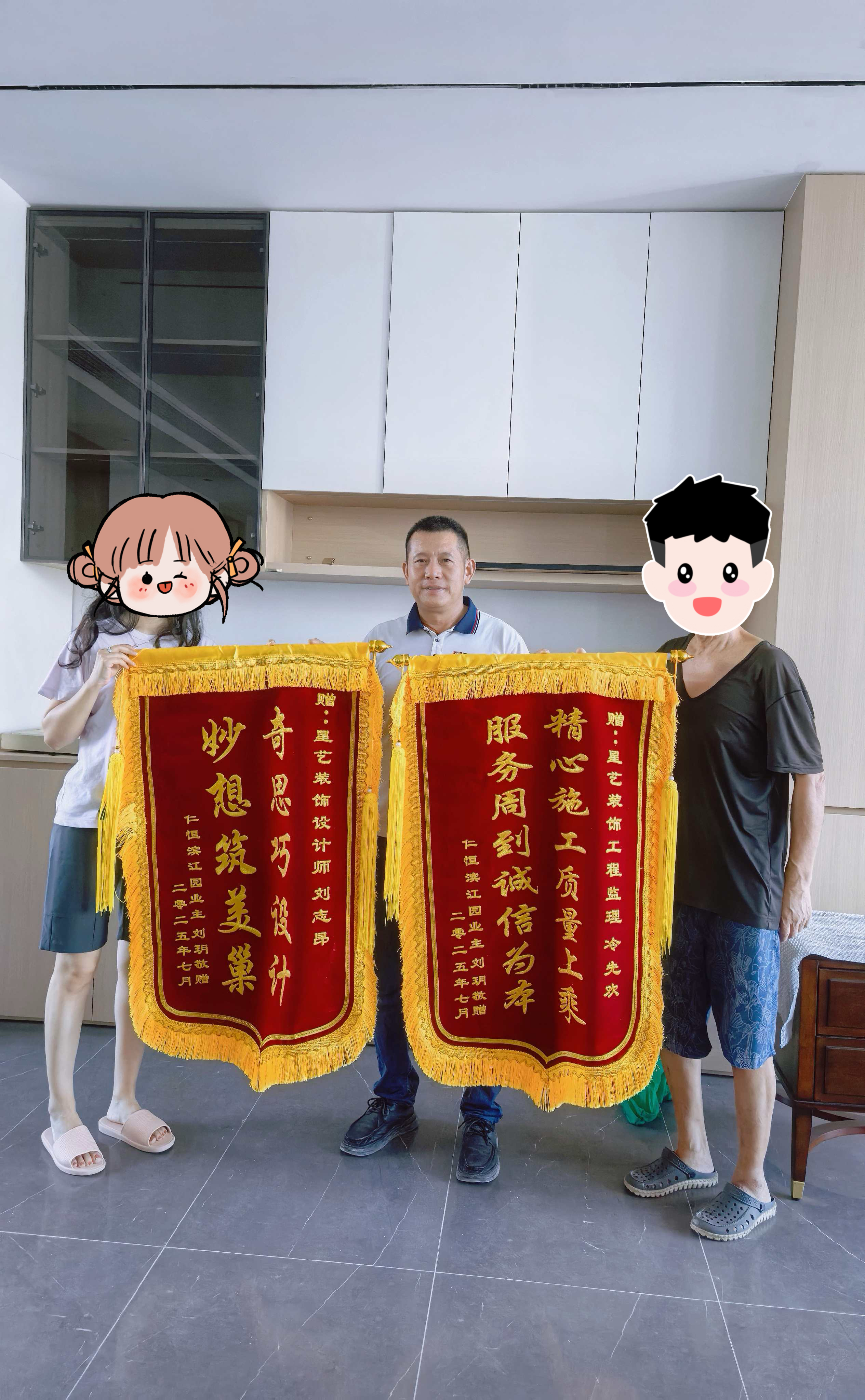 非常感謝星藝全體成員的協(xié)同配合,能讓我們的家以這么好的狀態(tài)呈現(xiàn),我們?nèi)叶挤浅M意。更要特此感謝我們的設計師劉志昂,和工程監(jiān)理冷先歡,感謝兩位的專業(yè)用心。懇請公司對二位的專業(yè)付出提出表揚。為了表達感謝特此為二位做了錦旗。后面還有很多鄰居還沒開始裝修房子,我們也會多多為公司推薦,期待星藝有更多更好的作品。再次感謝!