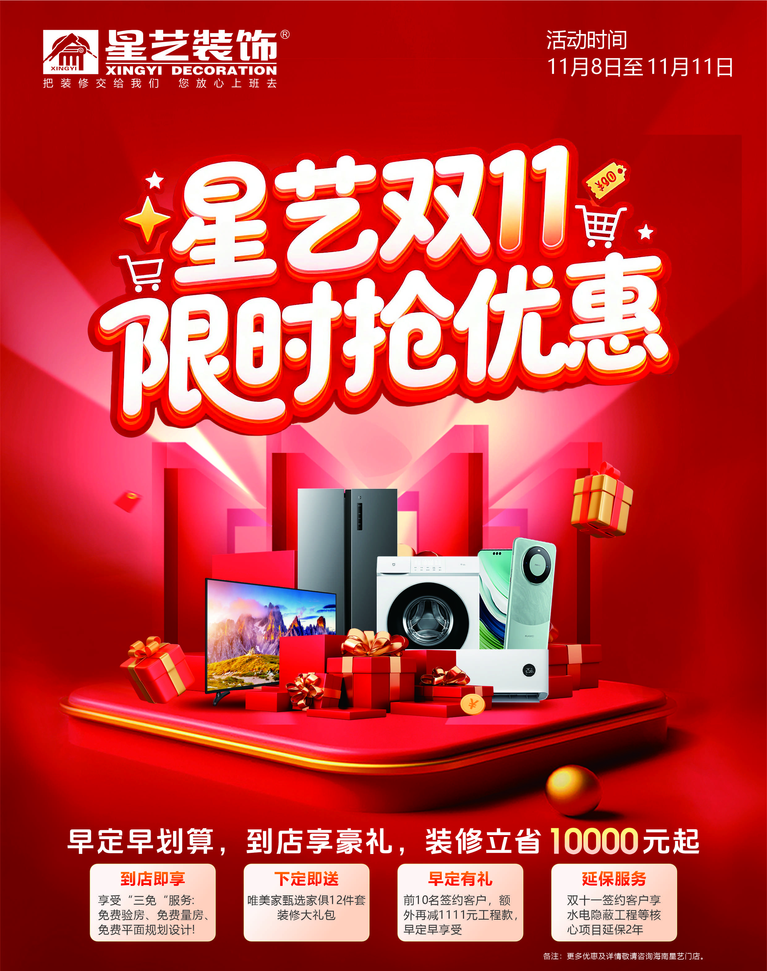 在這個(gè)雙十一,讓我們拋開(kāi)繁雜的購(gòu)物選擇,專注于打造一個(gè)真正屬于您的溫馨家園。星藝裝飾愿以34年的專業(yè)積淀,為您構(gòu)筑理想中的生活空間,讓家的溫暖,從此開(kāi)始。