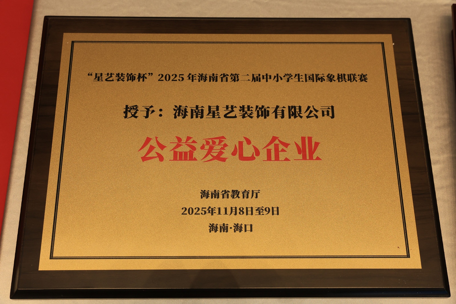 在頒獎典禮上,海南星藝裝飾有限公司被授予“公益愛心企業(yè)”榮譽。這一獎項旨在表彰其作為冠名贊助單位對本屆賽事及青少年智力運動發(fā)展所提供的大力支持,同時也感謝公司多年來對海南省中小學(xué)生國際象棋聯(lián)賽的持續(xù)贊助以及對海南國際象棋項目的鼎力相助。